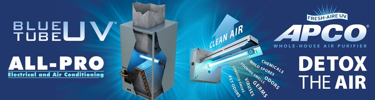 All-Pro Electrical & Air Conditioning, offers a variety of indoor air quality products including the APCO® whole-house air purifier which uses activated carbon and germ-killing UV-C light to remove odors, chemicals, and biological contaminants for the lifetime of your air system.